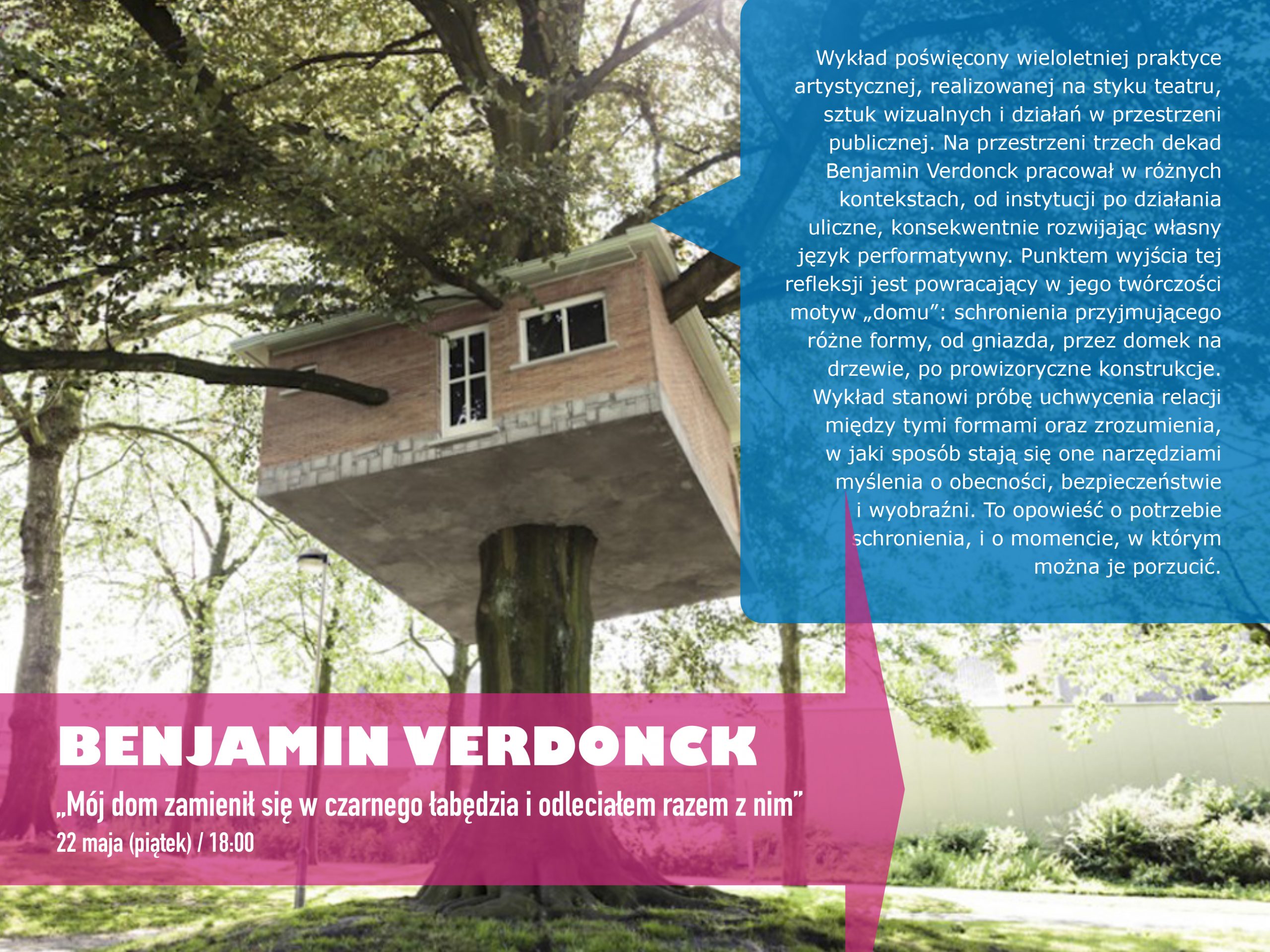 Wykład poświęcony wieloletniej praktyce artystycznej, realizowanej na styku teatru, sztuk wizualnych i działań w przestrzeni publicznej. Na przestrzeni trzech dekad Benjamin Verdonck pracował w różnych kontekstach, od instytucji po działania uliczne, konsekwentnie rozwijając własny język performatywny. Punktem wyjścia tej refleksji jest powracający w jego twórczości motyw „domu”: schronienia przyjmującego różne formy, od gniazda, przez domek na drzewie, po prowizoryczne konstrukcje. Wykład stanowi próbę uchwycenia relacji między tymi formami oraz zrozumienia, w jaki sposób stają się one narzędziami myślenia o obecności, bezpieczeństwie i wyobraźni. To opowieść o potrzebie schronienia, i o momencie, w którym można je porzucić.
