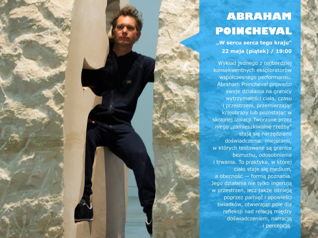 Wykład jednego z najbardziej konsekwentnych eksploratorów współczesnego performansu. Abraham Poincheval prowadzi swoje działania na granicy wytrzymałości ciała, czasu i przestrzeni, przemierzając krajobrazy lub pozostając w skrajnej izolacji. Tworzone przez niego „zamieszkiwalne
