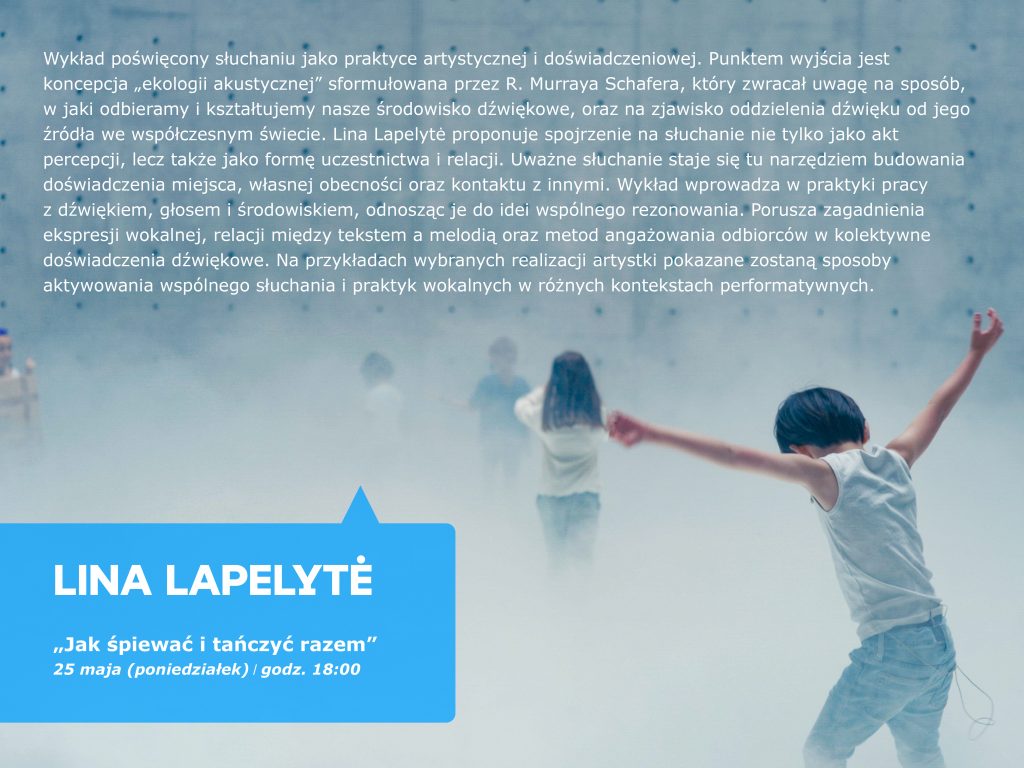 Lina Lapelytė jest artystką i kompozytorką, której praktyka zakorzeniona jest w muzyce, a jednocześnie dialoguje z popkulturą, stereotypami płci oraz nostalgią. W swoich pracach angażuje zarówno profesjonalnych, jak i nieprofesjonalnych wykonawców, często wykorzystując śpiew jako formę kolektywnego i afektywnego wydarzenia, które podejmuje kwestie podatności i wyciszania. Najbardziej znana jest z opery performatywnej „Sun and Sea”, nagrodzonej Złotym Lwem na