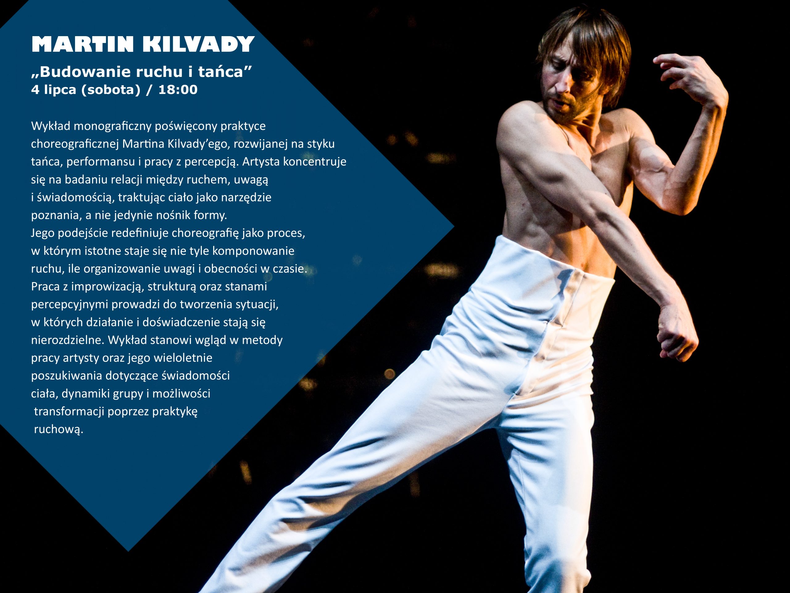 Wykład monograficzny poświęcony praktyce choreograficznej Martina Kilvady’ego, rozwijanej na styku tańca, performansu i pracy z percepcją. Artysta koncentruje się na badaniu relacji między ruchem, uwagą i świadomością, traktując ciało jako narzędzie poznania, a nie jedynie nośnik formy. Jego podejście redefiniuje choreografię jako proces, w którym istotne staje się nie tyle komponowanie ruchu, ile organizowanie uwagi i obecności w czasie. Praca z improwizacją, strukturą oraz stanami percepcyjnymi prowadzi do tworzenia sytuacji, w których działanie i doświadczenie stają się nierozdzielne. Wykład stanowi wgląd w metody pracy artysty oraz jego